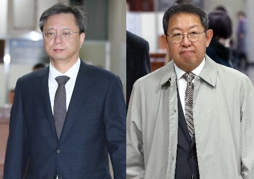 우병우(왼쪽) 전 청와대 민정수석과 이석수 전 대통령 직속 특별감찰관이 27일 서울 서초구 서울중앙지방법원에서 열린 '국정농단 방조' 24차 공판에 피고인과 증인 신분으로 각각 출석하고 있다. 사진/뉴시스