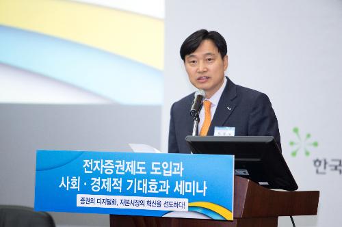 이병래 사장은 개회사를 통해 전자증권제도의 사회·경제적 기대 효과가 실물증권의 발행·유통비용 절감수준을 뛰어넘을 것이라고 강조했다. 이 사장은 “전자증권제도는 발행회사에게 자금 조달 기간 단축으로 한층 고도화된 경영·재무전략 수립을, 금융투자업자에게는 새로운 금융상품 개발을 통해 보다 많은 사업 기회를, 투자자에게는 신속·정확한 증권발행을 통한 자본시장에 대한 신뢰와 투자의욕을 불러일으킬 것”이라고 말했다.