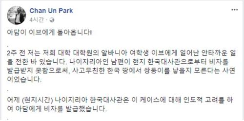 박 교수는 이날 SNS에서 A씨의 소식을 전하면서 “어려운 사정 속에서도 인도적 결단을 내려준 관계 당국(외교부 및 법무부)에 감사드립니다. 비자발급은 두 사람과 곧 세상에 나올 아기에게 큰 선물이 될 것입니다”라고 말했다.