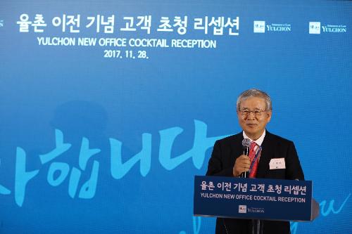우창록 법무법인 율촌 대표가 28일 신사옥인 파르나스타워에서 열린 사옥 이전 기념 리셉션에서 인사말을 하고 있다. 사진/율촌