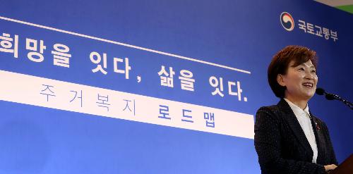 김현미 국토교통부 장관이 29일 오전 서울 강남구 자곡동 더스마티움에서 주거복지 로드맵을 발표하고 있다. 사진/뉴시스