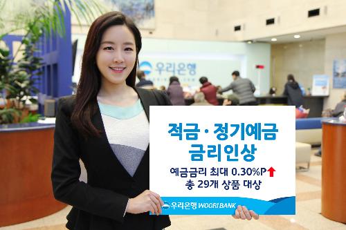 [뉴스토마토 백아란 기자] 우리은행은 한국은행 기준금리 인상에 따라 서민금융상품인 적금, 정기예금의 금리를 최고 0.30%포인트 인상한다고 30일 밝혔다.