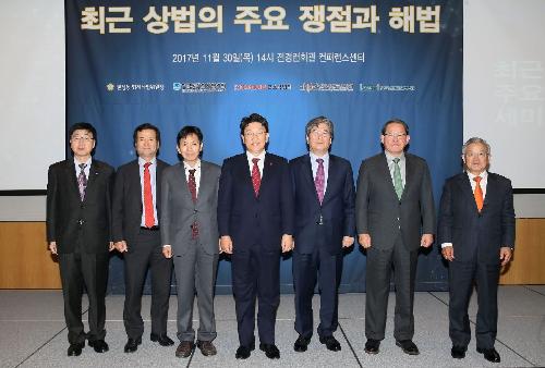 ‘최근 상법의 주요 쟁점과 해법’ 세미나에 참석한 발표자와 패널들이 기념사진을 촬영하고 있다. 사진 왼쪽부터 김정운 한국상장회사협의회 부회장, 김재철 코스닥협회 회장, 최준선 성균관대 명예교수, 권성동 국회법사위 위원장, 홍복기 연세대 교수, 강호갑 중견기업연합회 회장, 권태신 한경연 원장. 사진/코스닥협의회