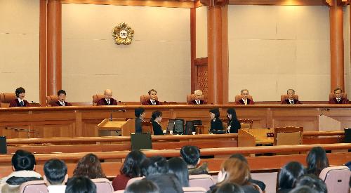 이진성(왼쪽 네번째) 헌법재판소장이 30일 오후 서울 종로구 헌법재판소 대심판정에서 열린 11월 심판사건 선고를 위해 자리에 앚아 있다. 사진/뉴시스