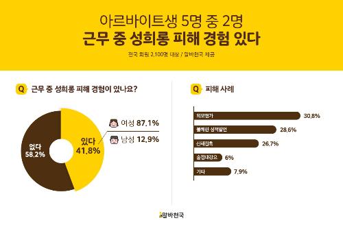 응답자의 41.8%가 성희롱 피해를 경험했으며 이 중 여성은 87.1%, 남성이 12.9%를 차지하는 것으로 나타났다.
