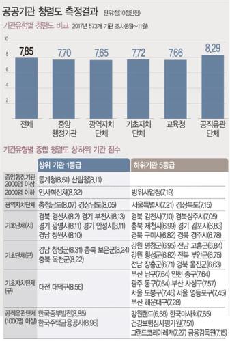 기관유형별로 살펴보면 공직유관단체의 종합청렴도가 8.29점으로 가장 높았고, 기초자치단체(7.72점), 중앙행정기관(7.70점), 시·도 교육청(7.66점), 광역자치단체(7.65점) 순으로 조사됐다.