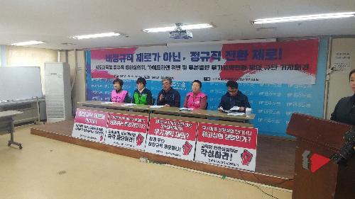 안명자 공공운수노조 교육공무직본부장은 “정부의 가이드라인과 기간제법을 위반하는 심의위를 인정할 수 없다”며 “노사 의견을 동등하게 반영할 수 있게 정규직 전환 심의위를 재구성하고, 당사자들의 충분한 의견 수렴을 해야 한다”고 강조했다.