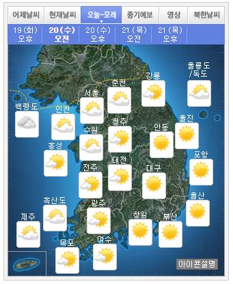 19일 기상청에 따르면 내일은 중국 중부지방에 위치한 고기압의 가장자리에 들다가 북서쪽에서 다가오는 저기압의 영향을 점차 받겠다.