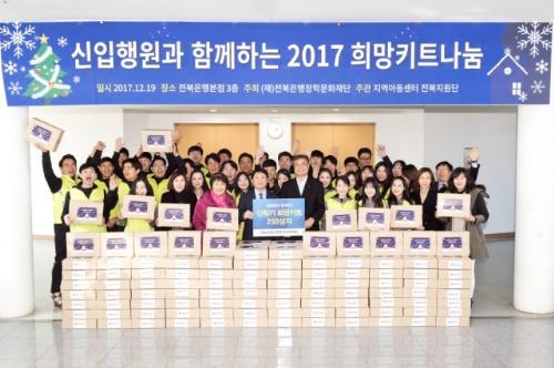 이날 전북은행 57기 신입행원 40여명은 한부모나 조손, 다문화가정의 아동들에게 필요한 종합장과 색연필, 크레파스 등 11종의 문구용품이 담긴 희망키트 250상자를 제작했다.