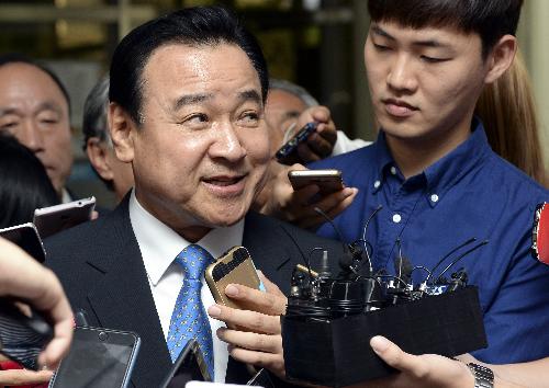 고 성완종 경남기업 회장으로부터 불법 정치자금을 받은 혐의로 기소된 이완구 전 총리가 지난해 9월27일 오전 서초구 서울고등법원에서 열린 항소심 선고 공판에서 무죄를 선고받은 후 법정을 나와 취재진의 질문에 답하고 있다. 사진 뉴시스
