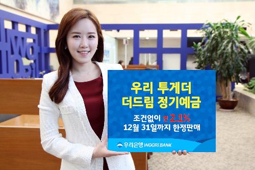 개인을 대상으로 한 '우리투게더 더드림 정기예금'은 별도의 우대조건 없이 만기까지만 유지하면 연 2.1%의 금리를 제공한다. 가입금액은 최소100만원, 최대1억원으로 5000억원 한도 소진시 판매 종료된다.