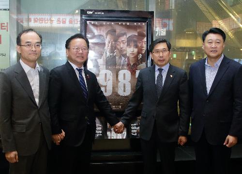 박상기 법무부 장관, 김부겸 행정안전부 장관, 문무일 검찰총장, 이철성 경찰청장이 28일 서울 강남구 영화관에서 영화 ‘1987’을 함께 관람하기 전 기념촬영을 하고 있다. 사진/법무부
