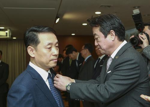 2018년 1월2일 경기도 과천시 코오롱 본사에서 열린 시무식에서 이웅렬 회장이 성장과 안정이라는 두 마리 토끼를 모두 잡자는 의미의 'CATCH 2018' 경영지침을 형상화한 배지를 신임 임원에게 달아주고 있다. 사진/코오롱