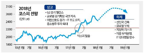 2018년 국내 주식시장에는 작년에 이어 경기회복세, 기업이익 서프라이즈에 따른 훈풍이 지속될 것으로 기대된다. 증권가에서는 연간 코스피 고점을 3000선 마저 넘긴 3100포인트로 제시하고 있다. 올해는 코스피의 밸류에이션이 본격적으로 정상화되고, 상장사들의 영업이익과 순이익 레벨업에 이어 매출액까지 개선될 여지가 크다고 봤다. 코스피 3000포인트는 밸류에이션 정상화만으로도 충분히 도달 가능한 지수대라는 것이다.
