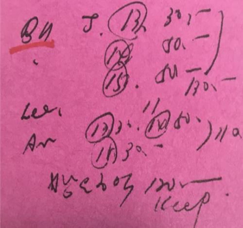 메모에는 “BH (청와대)·J(정호성) 13년 3,000만 원, 14년 5,000만 원, 15년 5,000만 원(합계 1억 3,000만 원) ·Lee(이재만) ‘〃’ ·An(안봉근) 13년 3,000만 원, 14년 5,000만 원, 15년 3,000만 원(합계 1억 1,000만 원) ·남은 금액 1억 2,000만 원 Keep 등의 내용이 기재돼 있다. 이 전 비서관 항목의 ‘〃’는 정 전 비서관가 같다는 의미다.