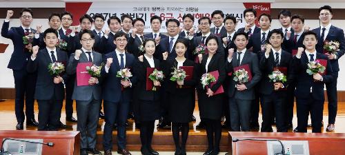 손 행장은 8주간의 신입행원 연수 과정이 담긴 동영상을 함께 시청한 뒤 연수 성적 우수자를 시상했다. 또 신입행원 한 명 한 명에게 휘장을 달아주고 사령장을 수여했다.