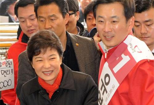 박근혜 전 대통령이 새누리당 비상대책위원장으로 있었던 2012년 경기도 군포시 산본시장을 방문해 당시 총선에 출마했던 유영하 후보 등과 함께 지역상권을 돌아보며 시민들과 인사하고 있다. 사진/뉴시스
