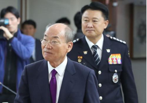 지난 2017년 10월19일 오전 서울 미근동 경찰청에서 열린 경찰개혁위원회 중간보고회에서 이철성 경찰청장과 박재승 경찰개혁위원장이 입장하고 있다. 사진/뉴시스