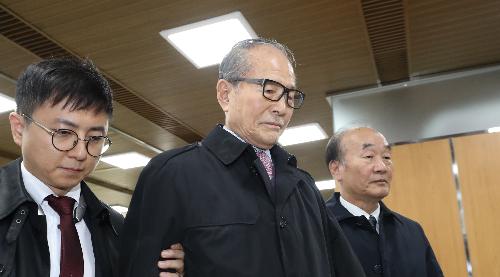 이명박 전 대통령의 친형인 이상득 전 새누리당 의원이 지난해 1월15일 오후 서울 서초구 서울중앙지법에서 열린 특정범죄 가중처벌법상 뇌물 혐의 2심 선고공판을 마친 뒤 법정을 나서고 있다. 사진/뉴시스