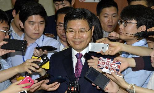제6회 전국동시지방선거가 있었던 2016년 6월 홍문종 새누리당 전 사무총장이 서울 여의도 국회 정론관애서 "성공한 대통령과 새누리당을 만들기 위해 당 대표에 출마한다."며 기자회견을 하고 있다. 사진/뉴시스