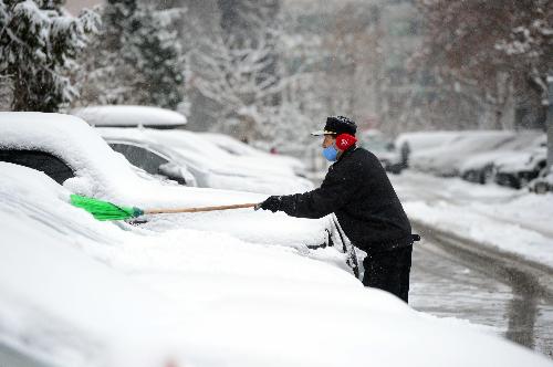 전국에 많은 눈이 내린 지난 20일 서울의 한 아파트에서 경비원이 눈을 치우고 있다. 사진/뉴시스
