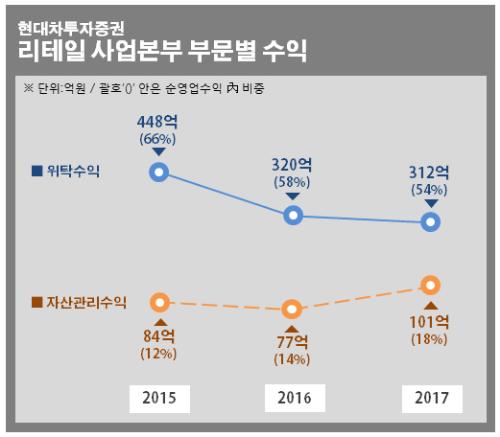 29일 현대차투자증권은 작년 말 기준 리테일부문의 세전이익이 13억원으로 2015년 이후 2년 만에 흑자전환에 성공했다고 밝혔다. 2017년 순영업수익은 전년 대비 3% 증가한 574억원이다.
