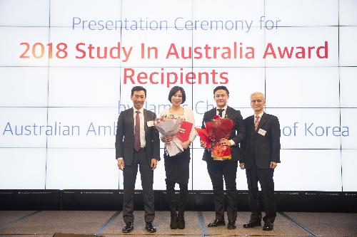 지난 26일 '호주의 날' 행사에서 (왼쪽부터)제임스 최 호주대사와 유학지원금 수상장 2명, 유희극 페퍼저축은행 전무가 기념사진을 찍고 있다. 사진/페퍼저축은행