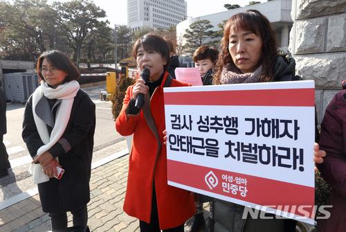 한 여성시민단체원들이 30일 대검찰청 앞에서 '여검사 성추행 사건'에 대한 엄중조사를 촉구하고 있다. 사진/뉴시스