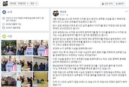 최 의원은 1일 자신의 페이스북에 글을 올려 “1월 31일 jtbc 뉴스에 의하면 서지현 검사 본인이 성추행 사실을 당시 북부지검에서 모시고 있던 간부들과 의논했다고 합니다. 당시 김모 부장검사에게 한시간 넘게 울면서 이야기를 했고 차장검사와 검사장에게도 보고되었다고 합니다. 김모 부장검사는 서 검사에게 문제제기를 할 지 의사를 물었으나 서 검사는 고심 끝에 문제제기를 하지 않기로 결정했다고 합니다”라고 주장했다.