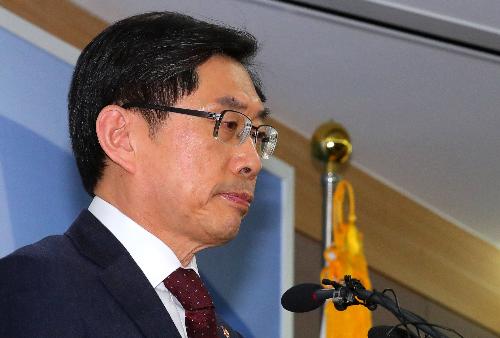 박상기 법무부 장관이 2일 오후 경기 과천시 정부과천청사 법무부에서 서지현 검사 성추행 피해 폭로 관련 성희롱·성범죄 대책위원회 발족 브리핑에 앞서 굳은 표정을 하고 있다. 사진/뉴시스