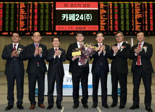 8일 쇼핑몰 솔루션 전문기업 카페24가 코스닥 상장 첫날 공모가 5만7000원 대비 48% 오른 8만4700원에 거래를 마쳤다. 사진은 이날 오전 한국거래소에서 열린 카페24 코스닥 신규상장기념식 모습. 사진/한국거래소