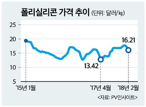 27일 태양광 시장조사업체 PV인사이트에 따르면 2월 넷째주 폴리실리콘 가격은 킬로그램(㎏)당 16.21달러로 전주보다 0.67% 내렸다. 폴리실리콘은 지난 1월에 ㎏당 최고 17.83달러까지 상승했다가 이후 7주 연속 내리막길을 걷고 있다. 하지만 국내 업체들의 폴리실리콘 손익분기점이 14~15달러 수준임을 감안하면, 우려할 수준은 아니라는 게 태양광업계의 중론이다. 업계 관계자는 "1~2월은 중국 춘제(春節) 여파로 거래물량이 일시적으로 감소하면서 가격이 등락을 겪은 것이지 글로벌 수급에는 차질이 없었다"며 "영업환경에 변화가 없어 3월부터는 다시 가격이 오를 것"이라고 내다봤다.