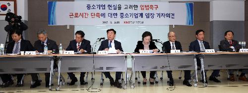 27일 근로기준법 개정안이 타결된 가운데 경영 부담 가중을 우려해온 중견·중기·소상공업계는 후속대책 마련이 필요하다고 입을 모으고 있다. 사진은 지난해 12월 열린 '근로시간 단축에 대한 중소기업계 입장 발표 기자회견' 당시 모습. 사진/뉴시스