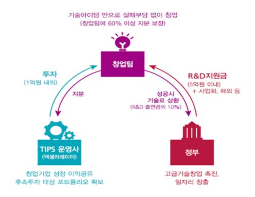 팁스는 2013년부터 고급 기술기반의 혁신창업을 촉진하고자 정부와 민간이 공동 협력·시행하고 있는 기술창업 플랫폼이다. 성공 벤처인 등 민간을 활용해 창업팀을 선별하고 민간투자와 정부R&D를 연계해 진행된다는 점이 특징이다.