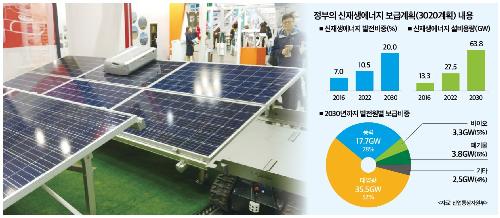 반면 국내는 2000년대 초까지도 석탄·원자력 중심이었다가 문재인정부 출범 후 '3020계획'을 내놓으며 이제야 신재생에너지 육성에 눈을 돌렸다. 3020계획은 2017년 기준 전체 전력생산에서 7.0%인 신재생에너지 비중을 2030년 20%까지 끌어올리겠다는 구상이다. 특히 5GW가 채 안 되는 태양광발전을 30GW대까지 확대하는 게 핵심이다.