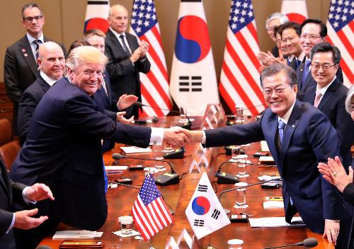 문재인 대통령(오른쪽)과 도널드 트럼프 미국 대통령이 지난해 11월7일 청와대 본관 집현실에서 열린 확대정상회담에 앞서 악수하고 있다. 사진/뉴시스