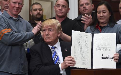 도널드 트럼프 미국 대통령은 지난 8일(현지시각) 백악관 루즈벨트룸에서 미국 철강과 알루미늄 노동자들이 지켜보는 가운데 수입산 철강과 알루미늄에 각각 25%, 10% 관세를 부과하는 행정명령에 서명했다. 행정명령의 효력은 15일 후부터 발생한다. 북미자유무역협정(NAFTA) 재협상 대상국인 캐나다와 멕시코는 관세 대상에서 제외됐다.