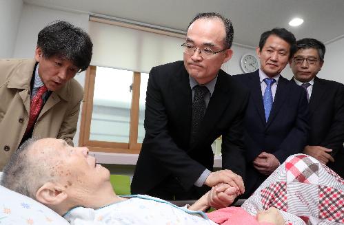 문무일 검찰총장이 20일 부산 수영구의 한 요양병원을 방문, 고 박종철 열사의 부친인 박정기씨를 만나 검찰의 과거사에 대해 공식 사과를 하고 있다. 맨 오른쪽이 김기동 사법연수원 부원장. 사진/뉴시스
