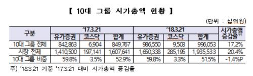 10대그룹의 시총은 증가했지만 10대 그룹에 속한 기업들의 수익률이 시장 수익률을 밑돌면서 전체 시장에서 차지하는 비중은 51.5%로, 1년 전보다 1.4%포인트 낮아졌다.