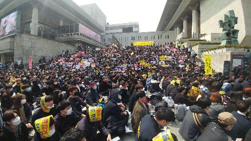 대한방사선협회 회원 2000여명(주최 측 추산)은 25일 오후 2시 서울 종로구 세종문화회관앞에 모여 “지난 수십 년간 방사선사가 해오던 일이 하루아침에 불법이 됐다”며 “초음파검사 시 의사뿐만 아니라 방사선사도 보험급여를 인정해달라”고 요구했다.