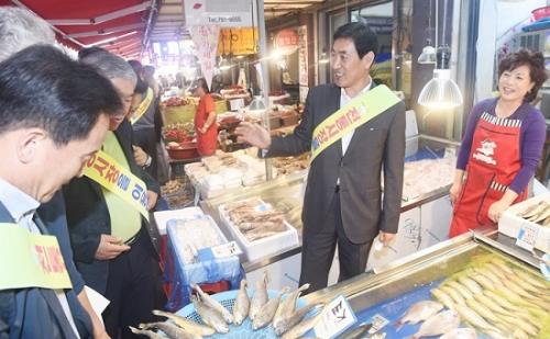 오수봉 하남시장이 지난해 9월 신장·덕풍전통시장을 방문해 상인들을 격려하고 있는 모습. 사진/뉴시스