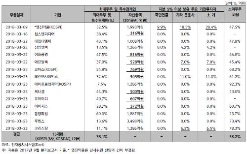 감사 선임 부결 상장사 중 8곳은 자산총액 1000억원 이하 중소기업이었다. 최대주주 및 특수관계인 지분율(33.1%)이 낮고 소액주주 지분비율(58.2%)은 상대적으로 높다는 특징도 보였다. 특히 국민연금이 지분을 보유한 곳은 1개사에 불과하는 등 기관투자자의 지분 보유 비율이 낮았다.