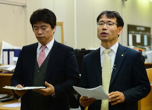 오영중(오른쪽) 변호사가 지난 2014년 11월17일 오전 서울 서초동 서울중앙지방법원 기자실에서 쌍용자동차 정리해고가 적법하다는 취지의 대법원 파기환송 판결을 비판하는 기자회견을 열고 있다. 사진/뉴시스