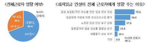 주요 대기업의 69.4%는 최저임금 인상이 해당 근로자뿐 아니라 전체 근로자의 임금 인상에 영향을 준다고 봤다. 그 이유로 '임금 동일화 또는 임금 역전 해소를 위한 임금 연쇄인상'(70.6%), '임근체계 개편에 따른 초과근로수당 증가'(50.6%), '노조의 임금인상 요구 강화'(37.6%) 순으로 응답했다. 한경연은 "대기업은 생산직 근로자의 약 70%가 호봉제로 최저임금 때문에 하위직급 임금을 인상하면 호봉표가 조정돼 전체 임금이 상향된다"고 분석했다.