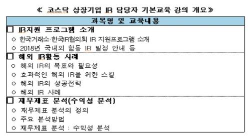 이번 상반기 교육은 한국거래소와 한국IR협의회의 ‘IR지원 프로그램 소개’와 해외 투자자 유치와 투명한 기업 회계를 위한 ‘해외 IR활동 사례’ 및 ‘재무제표 분석’에 대한 강의가 진행될 예정이다.