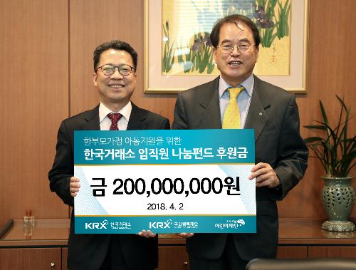 [뉴스토마토 심수진 기자] 한국거래소는 임직원들이 한부모 또는 조손가정 등 아동들을 돕기 위해 자율적으로 성금한 KRX임직원 나눔펀드 2억원을 어린이재단에 전달했다고 2일 밝혔다.