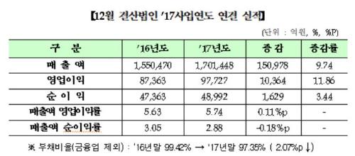 개별 기준으로 12월 결산법인 1105개사의 매출액은 128조9722억원으로 전년도보다 8.97% 증가했고, 영업이익도 17.27% 늘어난 8조2178억원을 기록했다. 반면 순이익은 3조8940억원으로 1.41% 감소했다.