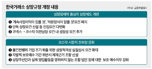 이번 개정안의 주요 골자는 ▲성장잠재력 중심의 상장제도 개편 ▲코스닥 시장의 신뢰성 강화로 요약된다.