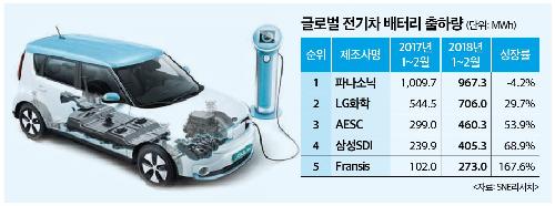 LG화학의 출하량은 지난해 같은 기간(544.5㎿h)과 비교해 29.7% 늘었고, 삼성SDI는 68.9%나 성장했다. 같은 기간 글로벌 1위인 파나소닉의 출하량이 4.2% 준 것과 비교하면 국내 업체들의 선전이 눈에 띈다. SNE리서치 관계자는 "LG화학과 삼성SDI의 성장세는 각 회사의 배터리를 탑재한 전기차 모델들의 판매가 늘어난 것이 주효했다"고 말했다.
