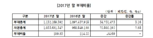 [뉴스토마토 심수진 기자] 지난해 코스피 상장사들의 재무 안정성이 개선된 것으로 나타났다. 코스피 상장사 585개사의 작년 부채비율은 109.53%로 2016년보다 4.69%포인트 감소했다.